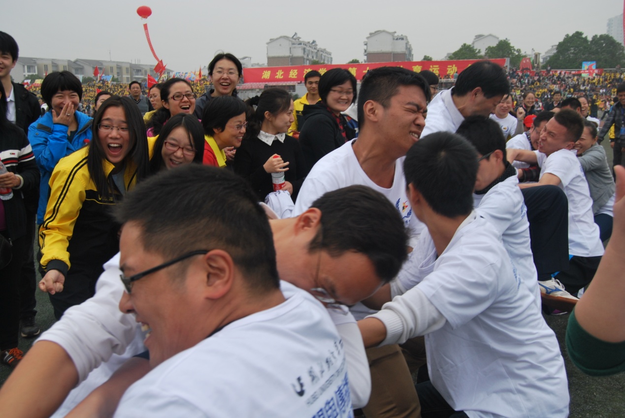 下午四点二十分,双方的运动员以红布条为中心分别聚集在粗绳两端,啦啦队、志愿者们将场地围得水泄不通。我院运动员手握麻绳、脚对脚,从第一位运动员起排成一字身体往后倾斜。口哨声响起,运动员们咬紧牙关、扯住绳子往后倒,“新闻,加油!”周围新闻学子们的喝彩声一浪高过一浪。本次比赛中接连两局,红布条均移向统计学院一方。四点二十四分,此次拔河比赛以统计学院获胜落下帷幕。