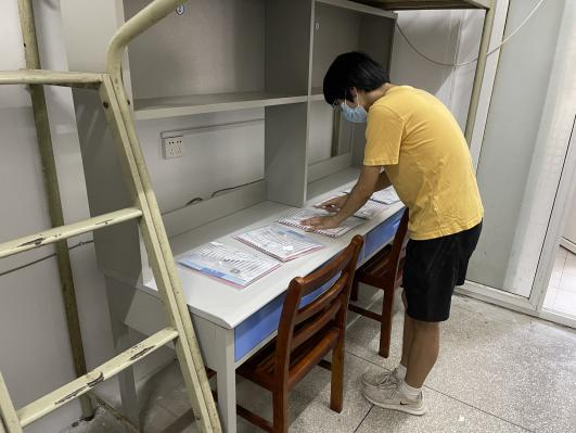 图为志愿者将新生资料袋提前放置宿舍