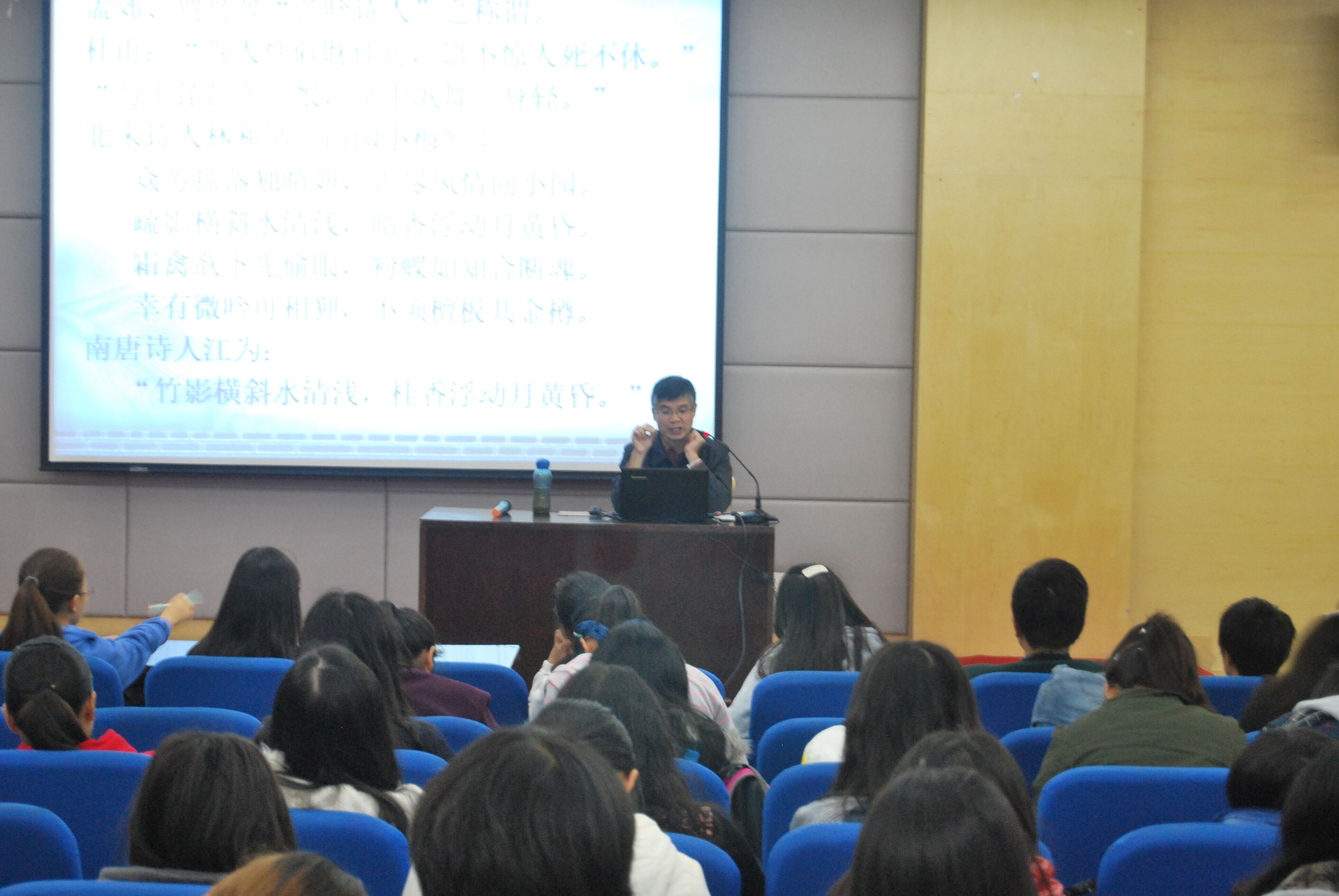 讲座一开始,钟教授便向学生们讲述了中国古典诗词的含义,“中国传统文化就是诗性文化,诗魂即国魂”。紧接着,他又列举了四大名著,中国古代戏曲,中国古代绘画中的诗句,从感性层面来认识中国古代诗歌;然后用意大利美学家维柯的思想,“一种东西的本性就是它的起源,原始人的思维和精神方式就是诗性智慧”,从理论层面来认识中国古代诗歌。并通过林和靖的《山园小梅》传授给学生们读诗的技巧,讲座现场学习氛围浓郁,同学们不时的与教授共同吟诗。现场气氛十分活跃。“希望今天的讲座会起到抛砖引玉的效果,也希望同学们能在研究诗歌的路上前进”,钟教授寄予厚望。