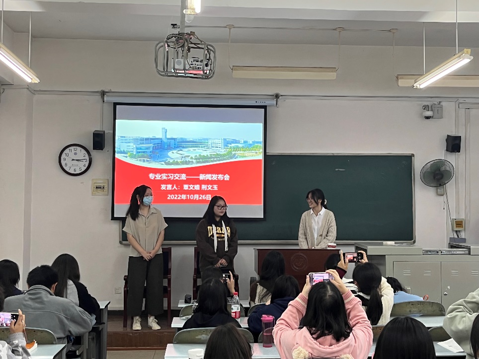 本网讯(记者 吴佳睿)10月26日下午,新闻学一流2141班《新闻采访与写作》课堂举办了一场以“专业实习交流”为主题的模拟新闻发布会,刚刚结束专业实习的大三学生覃文嫱、刑文玉分享了她们的专业实习经验,并接受同学们的现场提问。