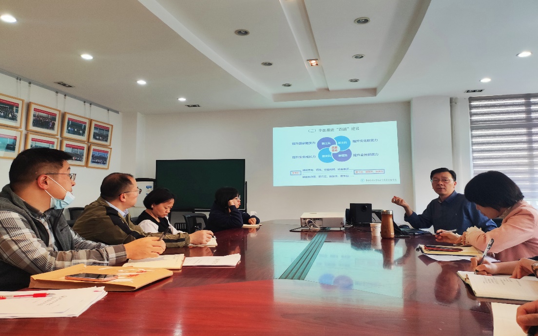 本网讯(通讯员吴佳睿)为深入贯彻落实全国教育大会和全国高校思想政治工作会议精神,推进我院课程思政工作落实落地,2022年11月10日,我院邀请华中科技大学新闻与信息传播学院副院长、博士生导师郭小平教授前来指导课程思政建设工作。院长王远坤、新闻学系主任夏兴通、新闻学系教师陈媛媛等出席会议,院长助理、学院教学负责人陈奕主持会议。