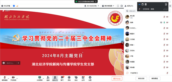 2024年8月17日,学生党支部围绕“学习贯彻党的二十届三中全会精神”主题,以线上形式开展8月党日活动,会议由辅导员卢翔老师主持,学生党员袁娟领学,党支部全体党员参会。