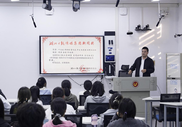 我院院长陈建华、副院长陈奕,以及部分专任教师一同参与了本次活动。活动开始前,湖北日报区域新闻中心副主任陈博雷与我院教师就融媒体人才实习实践进行了深入交流。陈建华表示,这次讲座拓展了我院学子的眼界,有利于促进同学们更好地了解融媒体发展趋势、了解成为一名优秀记者的各项必备能力。为新传学子如何在AIGC时代下提高自身专业技能提供了宝贵思路,有利于我院更好地培养高素质应用型人才。
