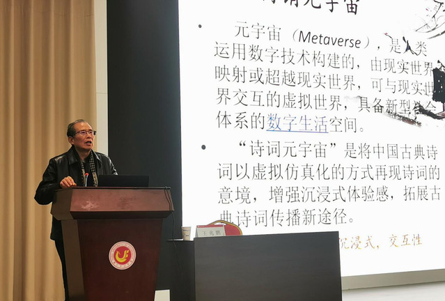 王兆鹏教授先从“元宇宙”和“诗词元宇宙”的概念入手,把现代前沿技术和传统诗词的融合进行了浅白易懂的分析,并从如何欣赏诗词的角度阐述想象和还原诗词情境的关键性,光是了解字句、故实、章法是远远不够的。他以孟浩然的《春晓》、李白的《黄鹤楼送孟浩然之广陵》等诗作为例,引导大家如何利用想象去填补诗句中的“空白”,而元宇宙的展示对于视频呈现又有怎样的超越性一系列问题做了具体分析。