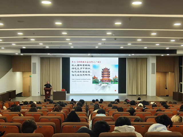 2024年11月25日晚,四川大学讲席教授、博士生导师、中国宋代文学会(筹)会长、中国词学研究会会长、中国李清照辛弃疾学会会长、中国韵文学会副会长王兆鹏教授莅临2138cn太阳集团,为我院融媒体优才2441班及国学班同学作题为“诗词元宇宙的设计与构建”讲座。讲座在学校大学生活动中心二号报告厅举行,副院长王世立主持,讲座开始前,全体师生起立对叶嘉莹先生的逝世进行了一分钟的默哀。