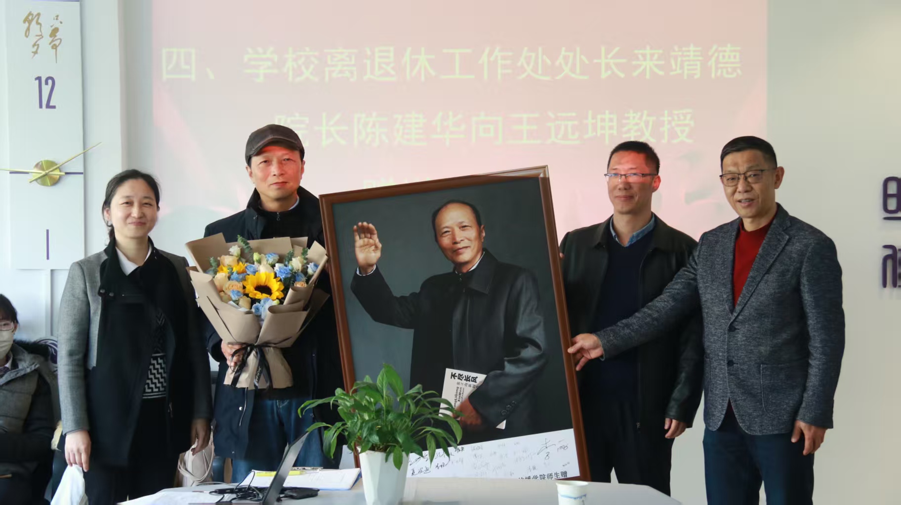 来靖德与陈建华共同向王远坤教授赠送荣休纪念品,全体教师合影留念。