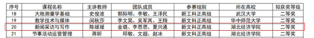 在近日落幕的第五届湖北省高校教师教学创新大赛上,我院新闻学系陈媛媛教授领衔的团队(成员:金璐、李思思、夏兴通)凭借出色的教学创新成果及现场表现,荣获“四新”及基础课程赛道正高组二等奖。这是我院教师团队首次入围该项赛事的省级比赛并获奖,实现了学院在该领域竞赛成绩的历史性突破。