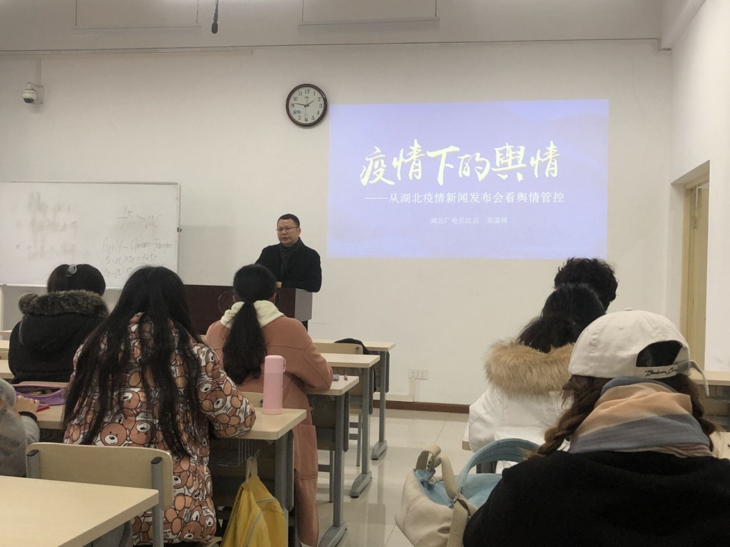 本网讯(通讯员 余瑶)12月9日下午,我院特聘产业导师、湖北广电融媒体新闻中心长江云客户端内容高级主管邓国辉受邀走进我院《舆论传播与舆情分析》课堂,结合疫情期间有关部门的疫情防控发布会情况,为新闻学专业Q1841班的同学带来了“疫情下的舆情”为主题的舆情管理课。
