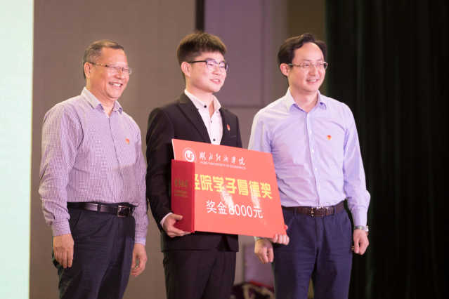 图为学校党委书记温兴生(左),学院党委书记汤中秋(右)为书画协会会长齐灏颁奖