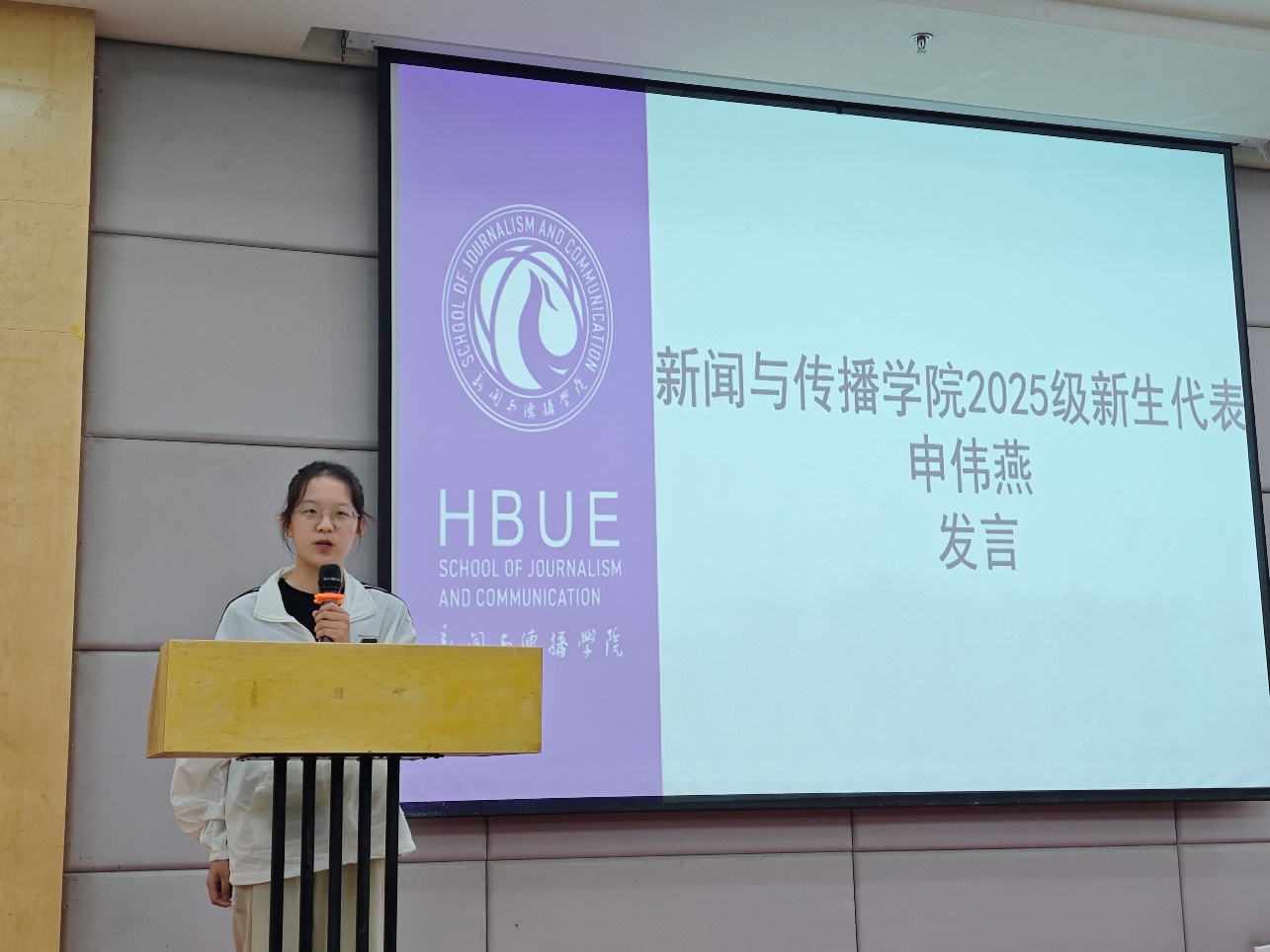 新生代表申伟燕表达了对大学生活的憧憬和期待,分享了自身要传播正能量,为推动社会发展贡献绵薄之力的专业追求,并代表全体新生承诺,将珍惜大学时光,认真学习,用年轻的笔触绘就这个伟大的时代。