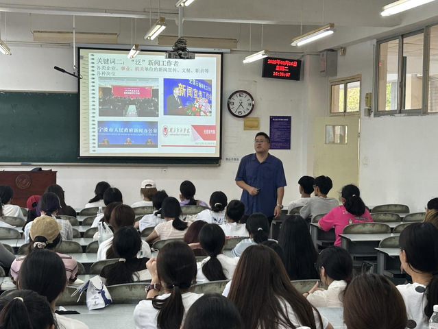 本网讯 9月16日,为帮助2025级新生更好地了解专业发展动态,激发专业学习兴趣,我院在教一开展了集中专业教育活动。学院副院长陈奕、新闻学系主任夏兴通、新媒体系主任夏青、中文系曾浪等老师为融媒体优才实验班、新闻学、网络与新媒体专业的新生们带来了一场内容丰富、深入浅出的专业启蒙。