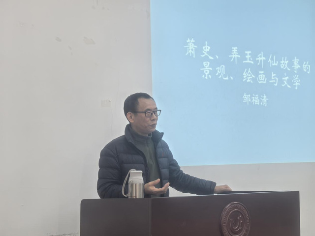 2025年11月27日下午,湖北大学文学院邹福清副教授应邀莅临我院,作题为《景观、绘画与文学:萧史、弄玉升仙故事的文本异构》的学术讲座。讲座在教5-105举行。