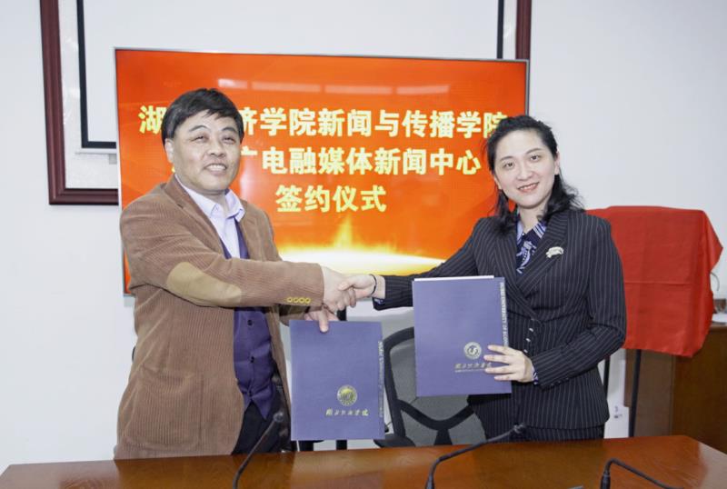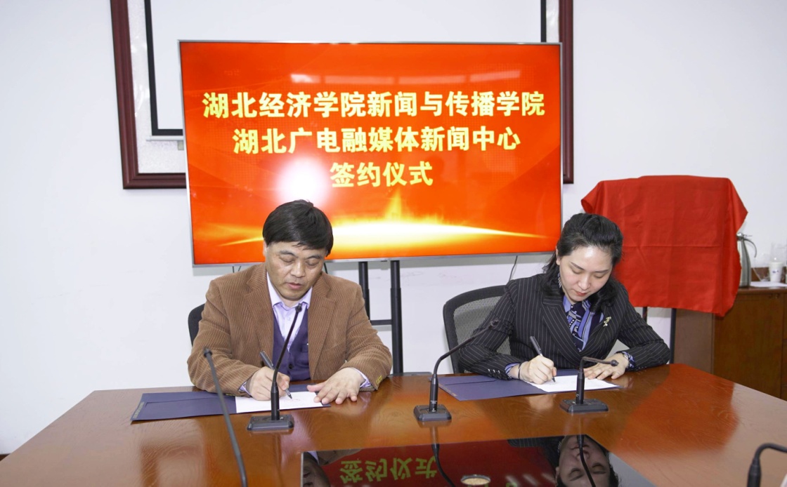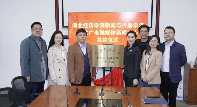 【本网讯】4月21日下午,我院与湖北广电融媒体新闻中心合作协议签约暨实习基地挂牌仪式在湖北电视台举行,学院副院长彭书雄教授、湖北广电融媒体新闻中心徐瑗副主任代表双方签署合作协议并为实习基地揭牌。