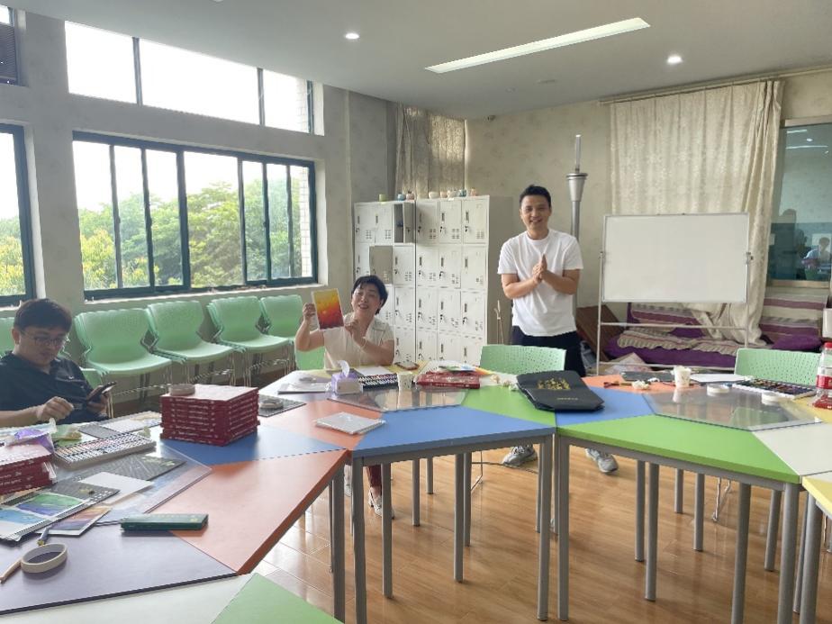 为深入开展学习贯彻习近平新时代中国特色社会主义思想主题教育,扎实推进“我为群众办实事”实践活动,辅导师生学习掌握舒解压力、自我调适方法技巧,提高师生身心健康水平。6月25日下午,2138cn太阳集团工会特邀武汉大学特聘绘画团辅教师李明老师和学校心理健康教育中心徐浪老师在实验1号楼团辅活动室,共同为师生们开展绘画静心减压团辅体验活动。