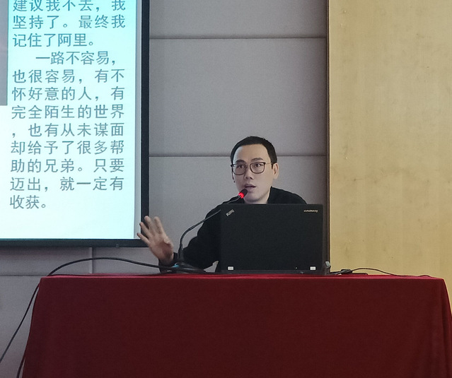 虞老师将自己的自驾旅程命名为“向西7889”,并以“7889”的含义为导引,从“为什么去西藏”、“为什么是一个人”、“信仰的力量”、“民族的交融”、“人生的反思”14个部分对自己自驾周游西藏、新疆的经历进行分享。虞老师解释到,“7889”是他西行21天所走的路程,是从武汉到中国伊尔克什坦口岸界碑的距离。虞老师通过一张张自己用相机或者手机拍摄的照片讲述自己的旅途故事,他认为,一人的旅程给予了他大量独自思考和放空内心的时间,让他重新捕捉了许多之前因各种原因忽略了的东西。他希望同学们在快节奏的生活中也能适时地慢下来,寻找美、发现美,重新审视自己之前的人生。