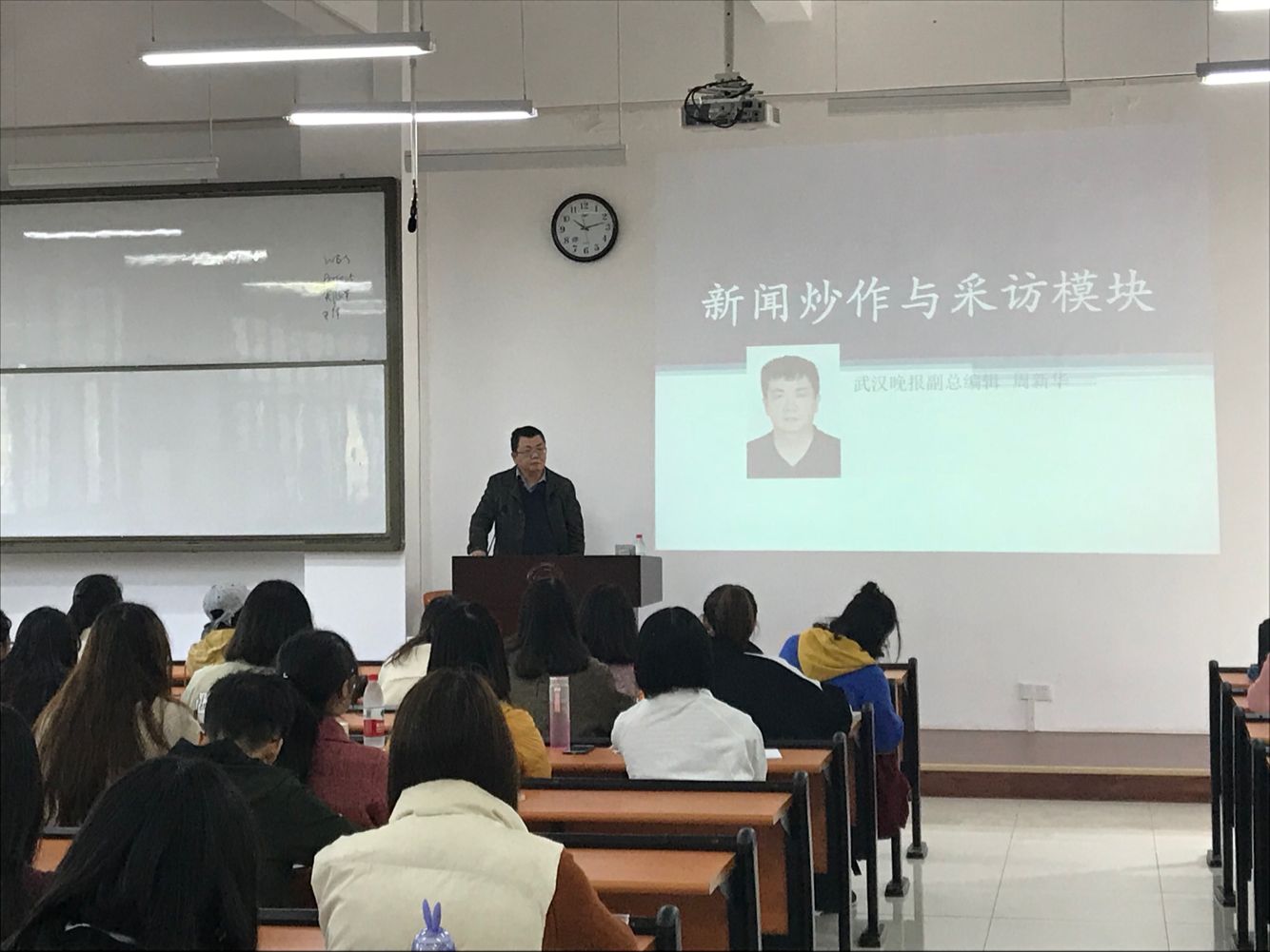 本网讯 (通讯员 薛灵毓)“面对宣传禁令的通稿,我们应该如何‘炒作’新闻赢得受众?”“新闻‘炒作’又有哪些技巧呢?”13日上午,武汉晚报副总编辑周新华走进我院《新闻采访与写作》课堂,与新闻Q1741、新媒体Q1741两个班同学讲了一堂“新闻炒作与采访模块”的生动课程。