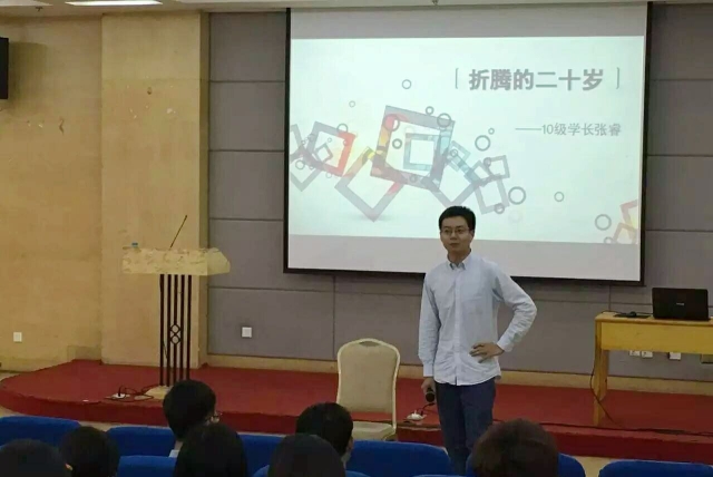 一开始,张睿在台下和同学们进行互动交流。在了解同学们暑假计划后,张睿讲起自己大二时候的记者实习经历。在与人交往和下乡报道这一系列的经历中,大二时候的张睿就感受到自己并不适合记者这个职业。在大三时,为了更多地丰富自己,张睿组合团队积极参加楚天都市报的活动,为了能拿到第一名,他和团队咬牙坚持并克服困难,最终获得了大学里的第一桶金,为自己大学经历添了精彩的一笔。也正是在大学的这次难忘的经历让他在大学毕业后就可以顺利的进入到北京一家广告公司工作。