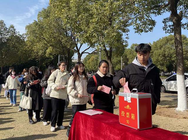 本网讯(通讯员 陈思语)12月1日,学院于体育馆门口草坪举行江夏区第六届人民代表大会代表选举活动,全院229名师生选民参与本次选举,活动由学院党委书记汤中秋主持。