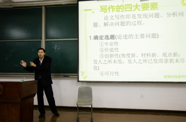 动员会上,张军教授为毕业生就学术论文写作的要素及格式进行了专题辅导。他全面介绍了论文写作的四大要素、论文格式、文献综述和开题报告的撰写等内容,对论文选题确定、收集材料、安排结构、语言运用、参考文献等方面做了详细的讲解。