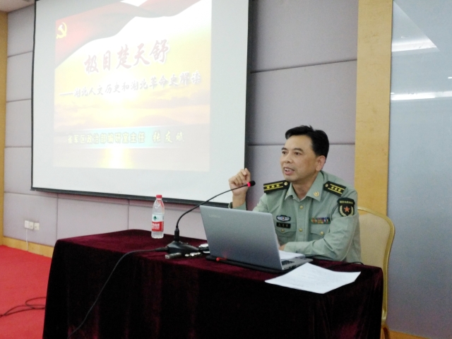 本网讯(通讯员陈贝贝 蒙宇坤 吴夕雨)在红军长征胜利80周年之际,10月12日晚,湖北省军区政治部编研室主任张友斌应邀为我院大一新生做“湖北省人文历史和湖北省革命史”的专题讲座。参与此次活动的有院党委书记汤中秋,张军教授,辅导员李兵。