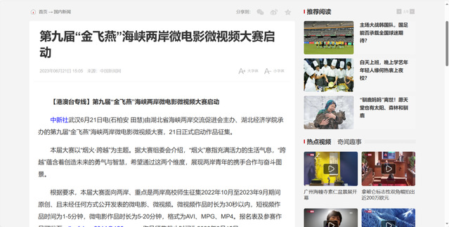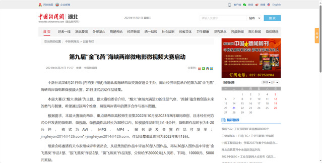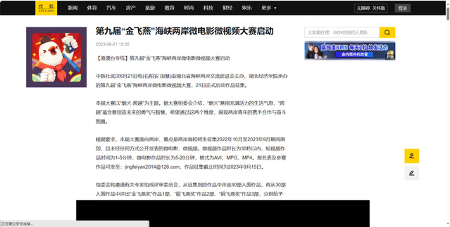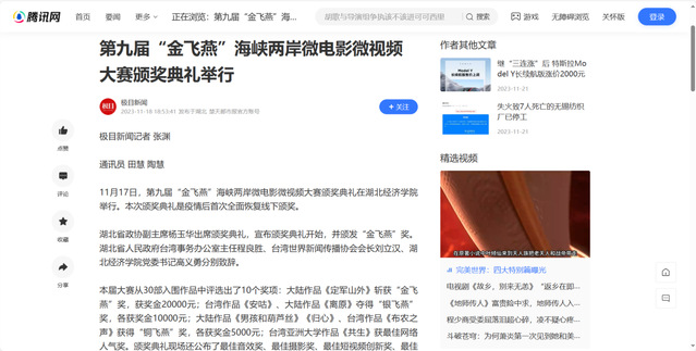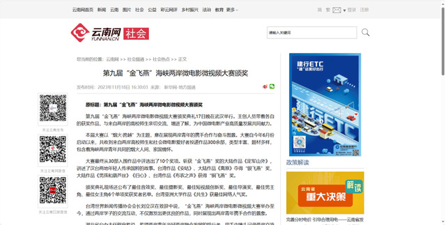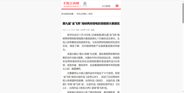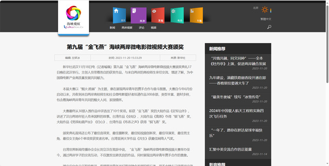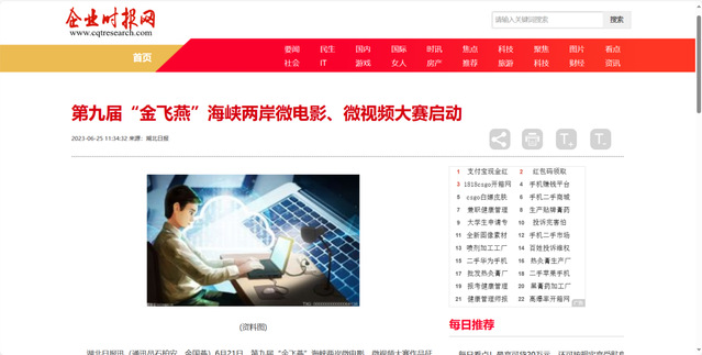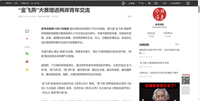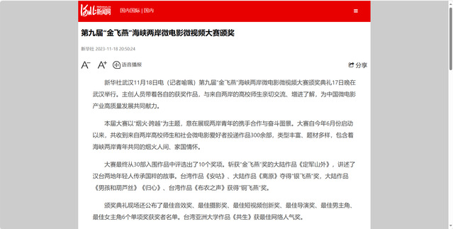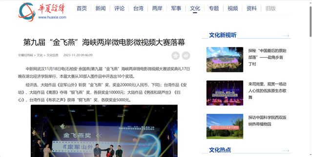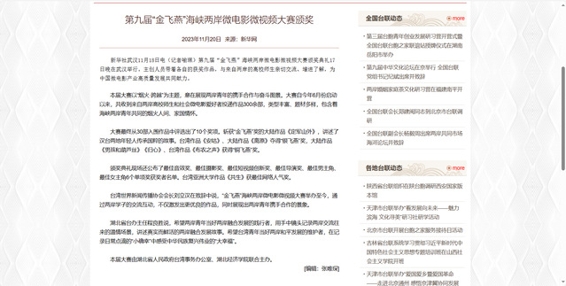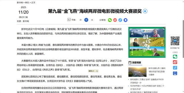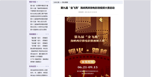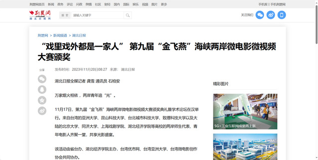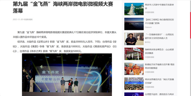 本网讯 2023年11月17日,由太阳集团2138、湖北省人民政府台湾事务办公室联合主办,2138cn太阳集团承办,台湾优市网、台湾亚洲大学、台湾微电影创作协会协办的第九届“金飞燕”海峡两岸微电影微视频大赛颁奖典礼暨学术论坛引起社会强烈反响。