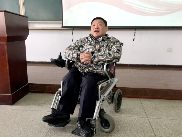 张教授还邀请他的同事李军专程赶到学校现身说法,与同学们分享自己的人生感悟。虽然从小患有小儿麻痹症,但李军拥有着超出常人的意志,通过不断努力,终于取得了从一个乡镇广播员到湖北楚天音乐广播总编室主任的发展成就。“人无论在逆境还是顺境中都要心怀感激,尤其要感激那些曾经帮助过自己的人;要习惯让自己比昨天更优秀;要习惯跟生命中的每一个人产生联系,热爱工作,热爱生活。”李主任如是说。