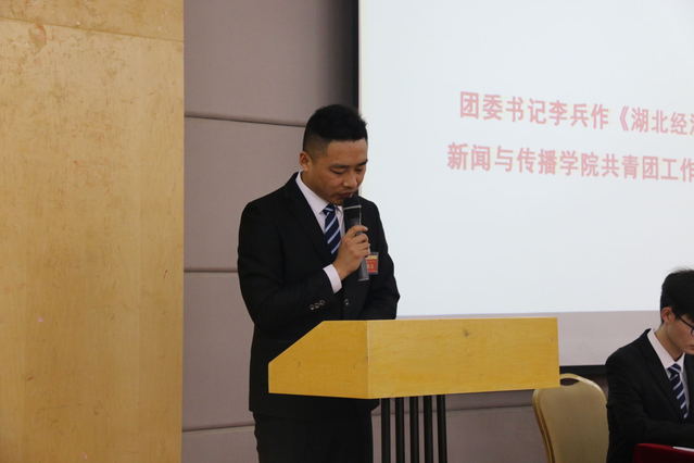 艺术设计学院团委副书记黄伦平致辞,他回顾了两院共青团工作合作的丰富成果,表示第一次团员代表大会的召开预示着我院共青团工作将迎来新的历史阶段,必将开创新的征程。