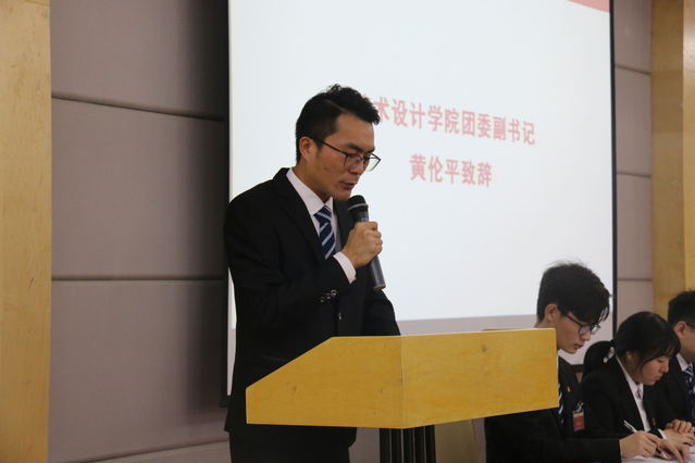 艺术设计学院团委副书记黄伦平致辞,他回顾了两院共青团工作合作的丰富成果,表示第一次团员代表大会的召开预示着我院共青团工作将迎来新的历史阶段,必将开创新的征程。