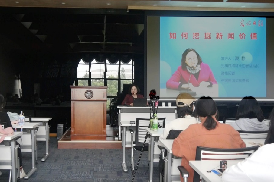 【本网讯】5月11日下午,光明日报湖北记者站站长、光明新闻创新实践中心主任、高级记者、华中科技大学兼职教授夏静邀莅临新闻传播学院,以“如何挖掘新闻价值”为主题进行专题讲座。讲座由我院院长王远坤教授主持,学院党委书记周志荣、部分专业教师和学生代表参加了本次讲座。
