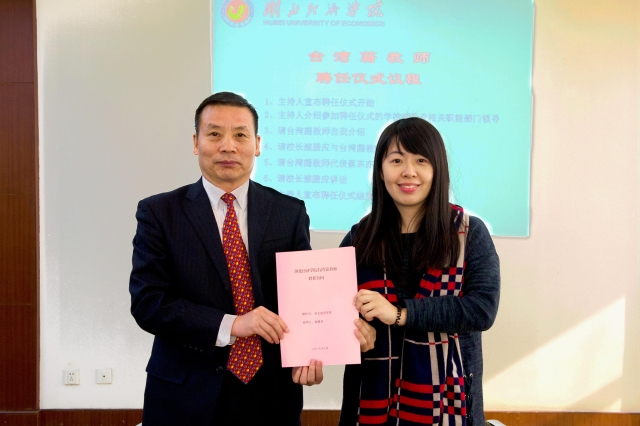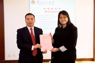 本网讯3月2日,学校举行2017年度第一批台湾籍教师聘任仪式。校长漆腊应分别与包括我院谢雅卉、詹今慧在内的七位台湾籍教师签订聘任合同。