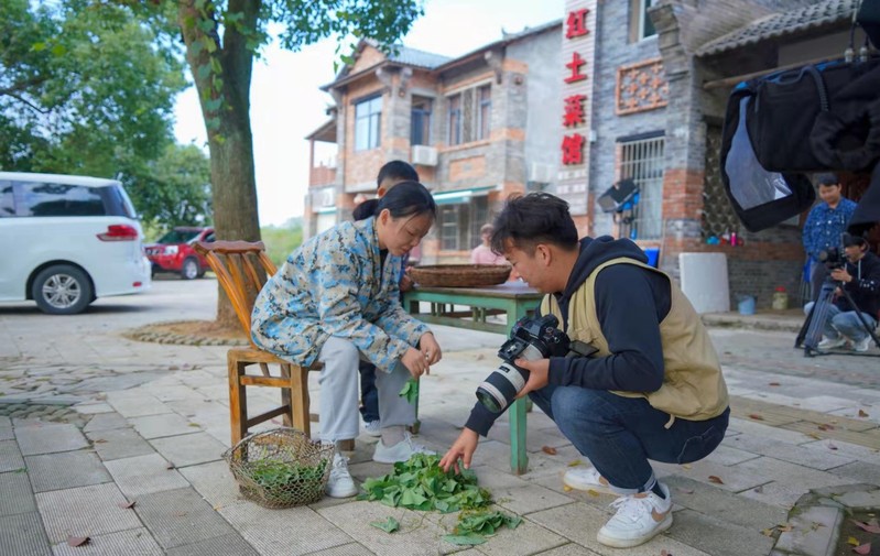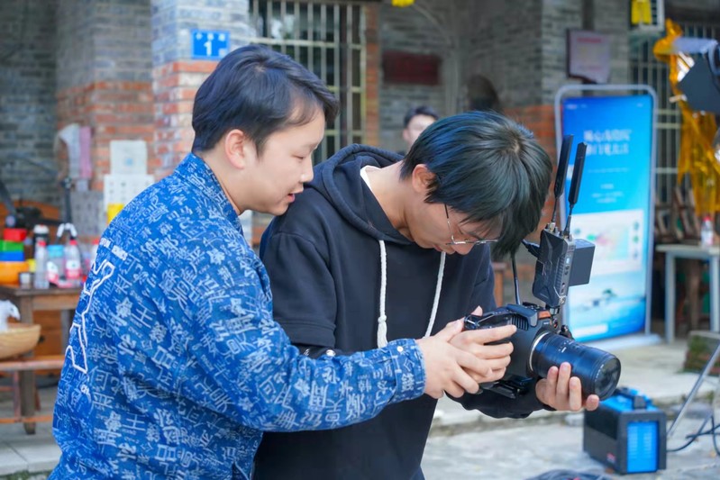 图为现场拍摄花絮,左一为学生演员杨敏,饰演吕祖旺母亲